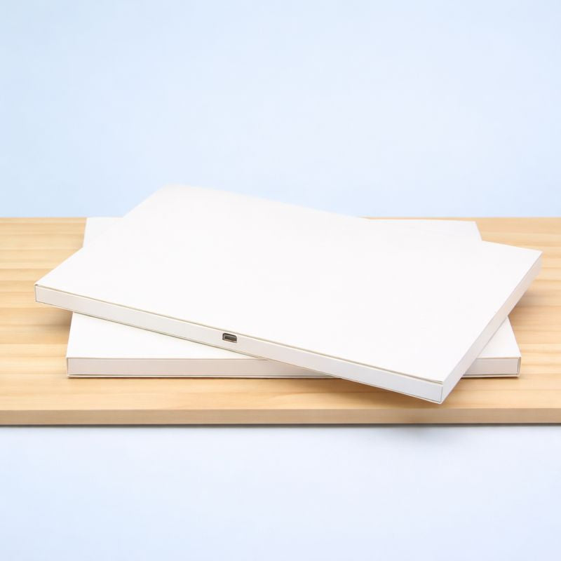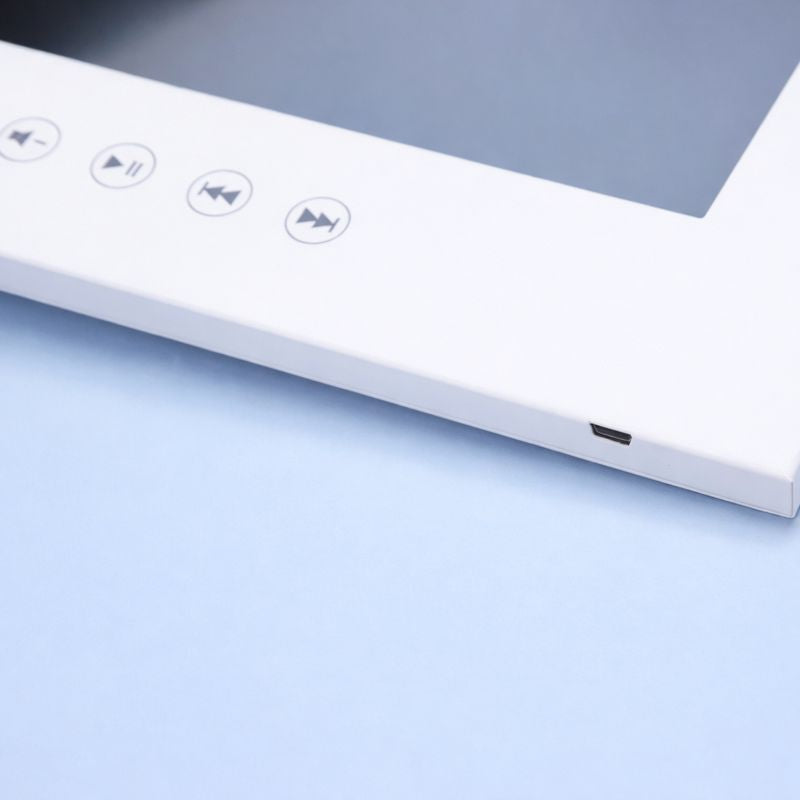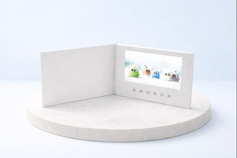 Conecta el libro al ordenador, arrastra tus vídeos o fotos y desconéctalo. Al abrirlo, el contenido se reproduce automáticamente en la pantalla con sonido integrado. Así de sencillo.