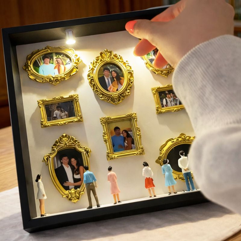 Incluye un marco decorativo con iluminación LED integrada, una selección de marcos ornamentales en miniatura y figuras decorativas para crear la escena.